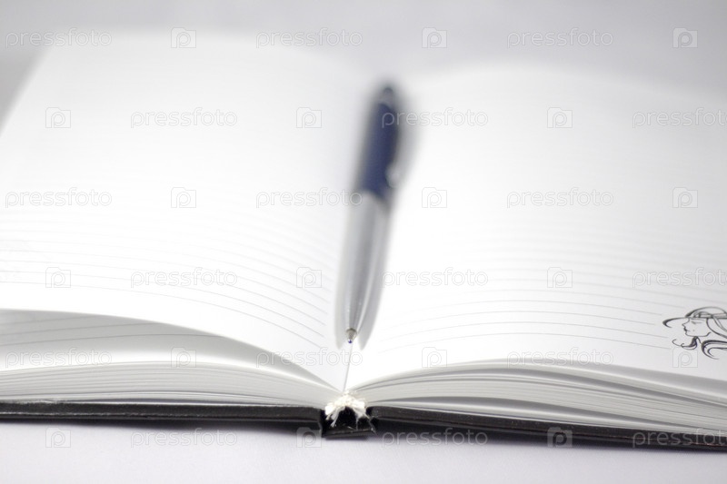 Черный открытый блокнот, на котором лежит темно-синяя шариковая ручка, представлен на белом фоне
