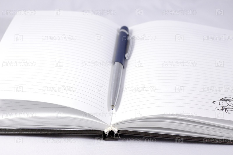 Черный открытый блокнот, на котором лежит темно-синяя шариковая ручка, представлен на белом фоне