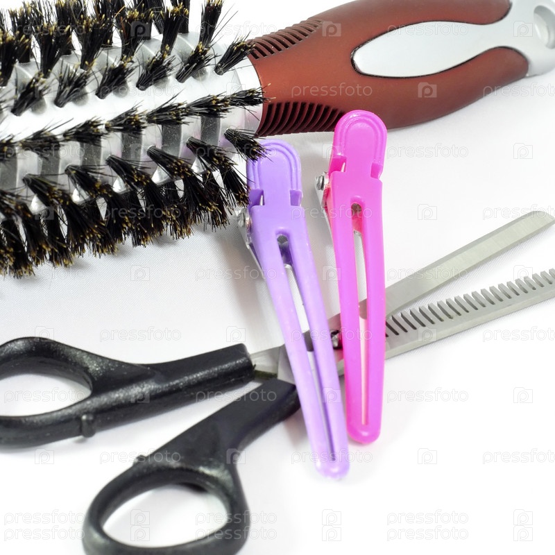 Набор инструментов парикмахера, состоящий из ножниц, кисти для волос и двух штифтов, лежит на белом фоне