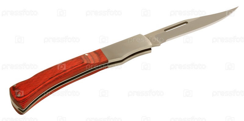 Острый складной нож с деревянной ручкой на белом фоне. Вид с разложенной ручки
