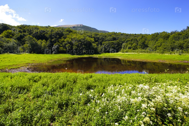 Небольшое озеро в горах, зеленая растительность и голубое небо с облаком. Пейзаж