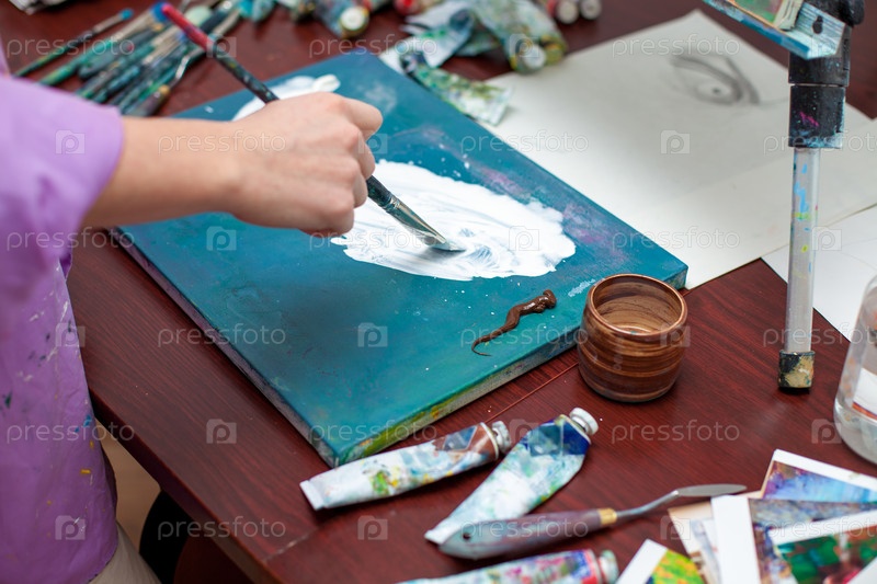 Крупный план рука художника на фоне палитры