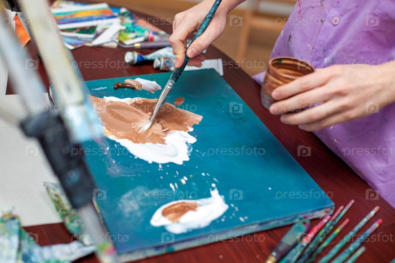 Крупным планом руки художника на фоне палитры