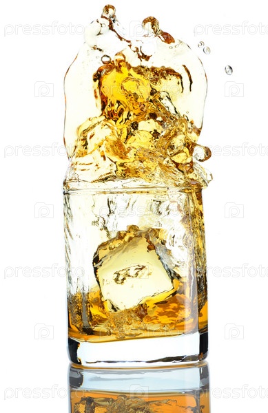 Кубик льдаупал в скотч с брызгами, изолированный на белом