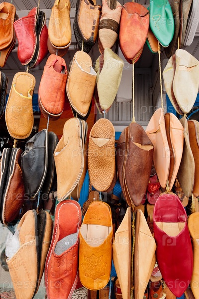Традиционная марокканская обувь бабуши на прилавке уличного магазина