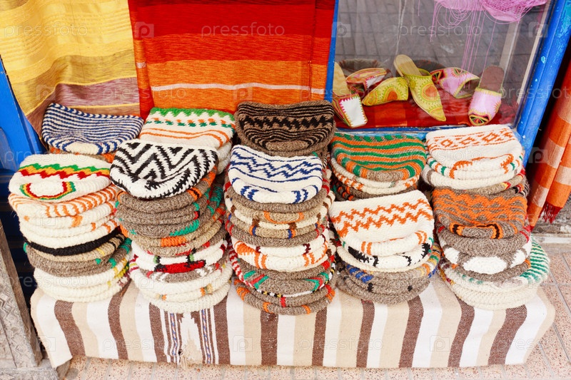 Вязаные шапки на прилавке уличного магазина. Марокко