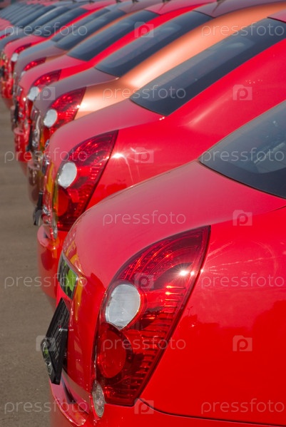 Ряд новых автомобилей на стоянке в магазине