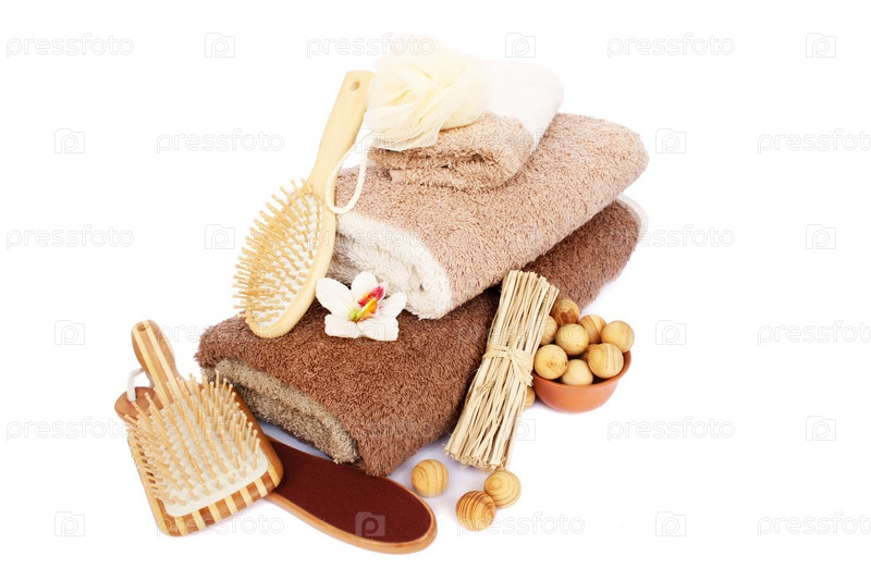 Полотенца и другие спа-принадлежности на белом фоне