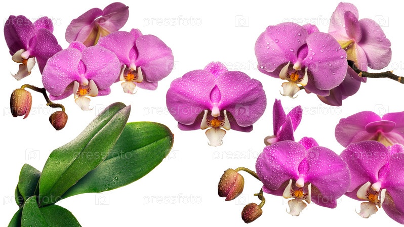 Цветущая Орхидея с роса падает. Коллаж. Изолированные