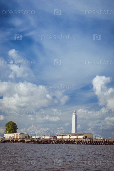 Панорамный вид с набережной на пирс с маяком и якорь судов в Кронштадт, Россия