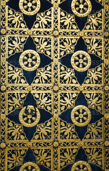 Древняя деревянная дверь с узорами из кованого железа