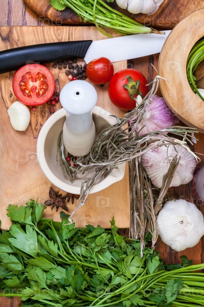 Вид сверху керамическая ступка и пряные ингридиенты