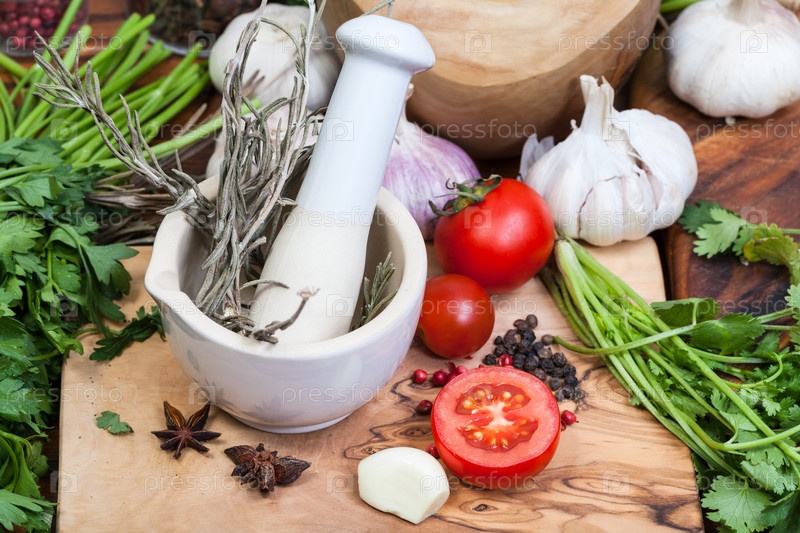 Керамическая ступка с пестиком зелень на столе