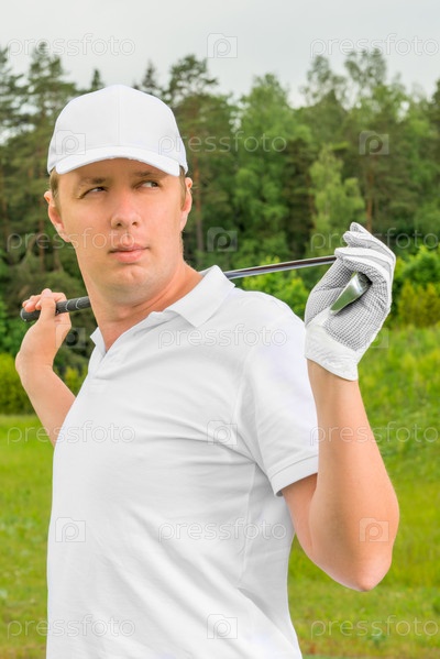 Гольф в белой футболке и бейсболке с гольф-клубом