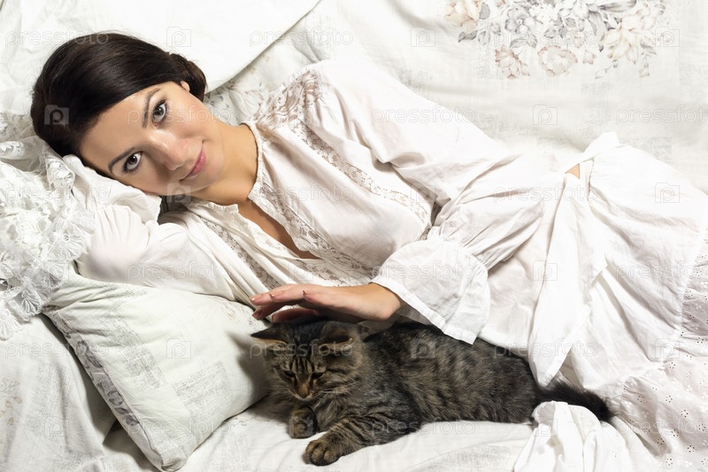Девушка в домашнюю атмосферу, петтинг котенка. Дом отдыха. Свободное время