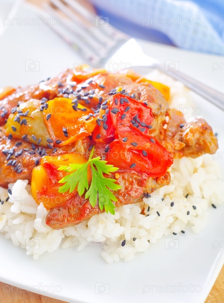 Вареный рис с мясом и овощами