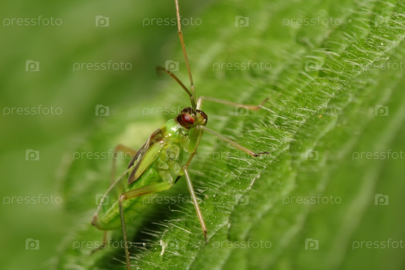 Зеленый кузнечик на зеленом листочке