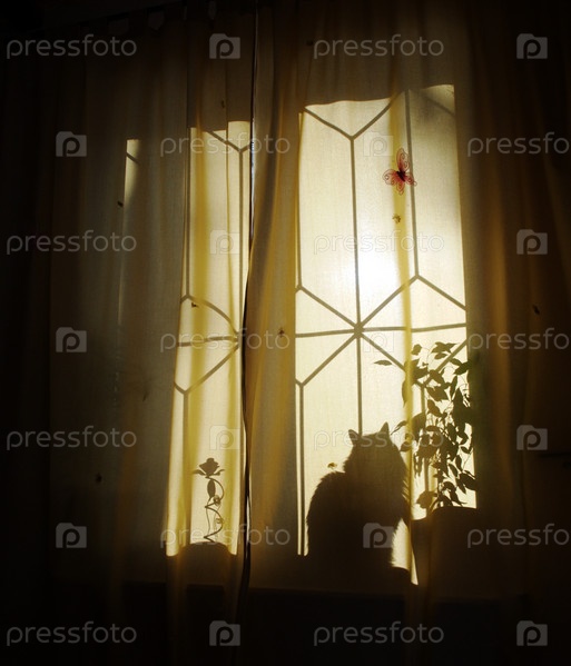 Кошка сидит за шторкой