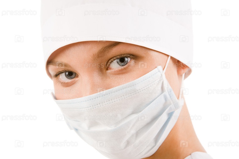 Лицо медсестры в стерильной маске, смотрящей на камеру над белым фоном
