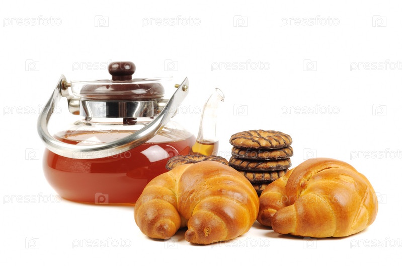 Свежие круассаны и печенье с черным чаем на белом фоне