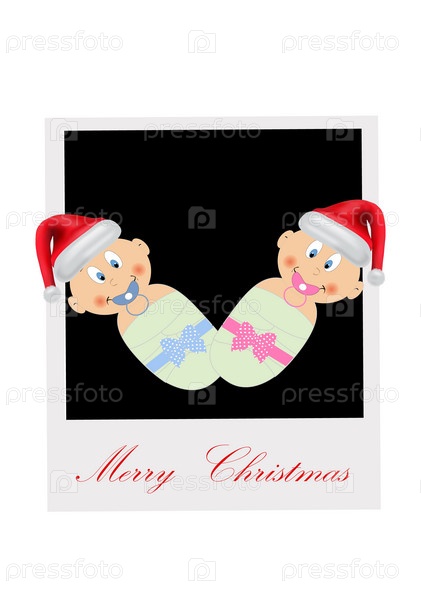 Фотокарточка с двумя младенцами на черном фоне и подписью "счастливого рождества", изолированная на белом фоне