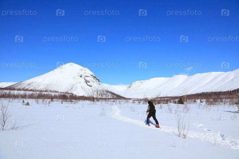 Человек идет на лыжах по тропе в горной долине