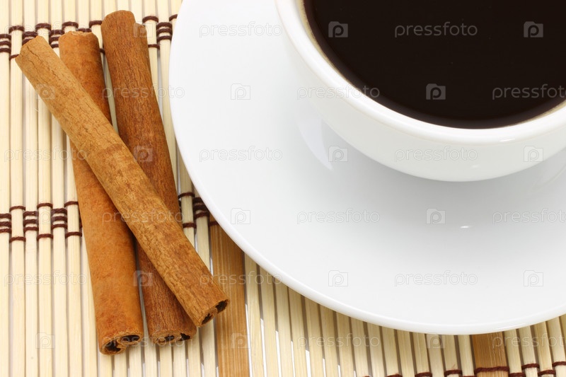 Чашка кофе на блюдце и палочки корицы крупным планом