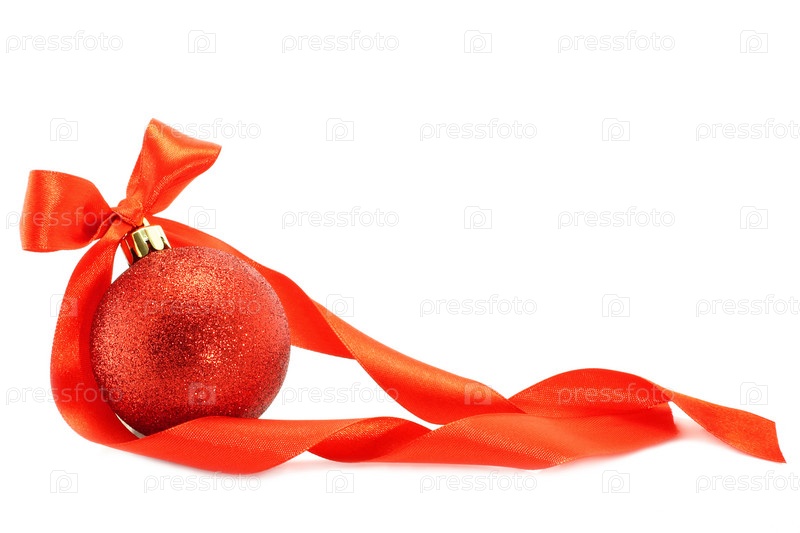 Красный елочный шарик с лентой на белом фоне