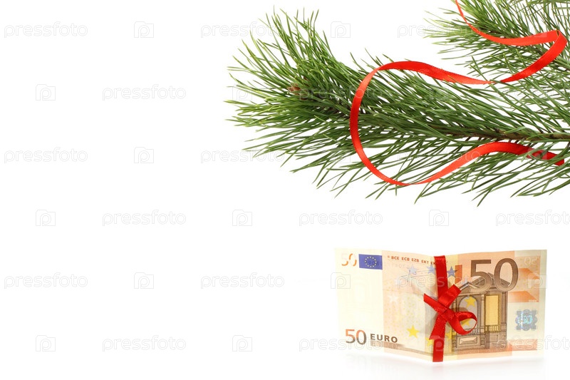 Сосновая ветка и 50 евро в качестве подарка на белом фоне