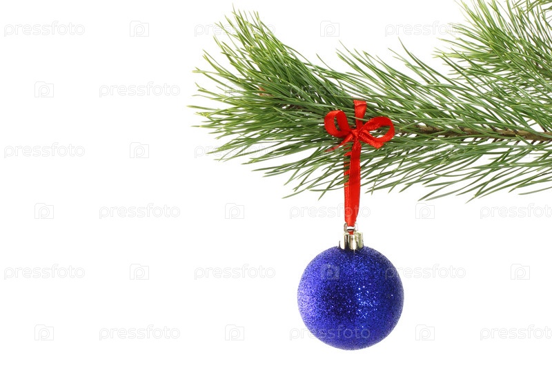 Елочная игрушка на сосновой ветке на белом фоне