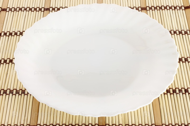 Белая тарелка на бамбуковой салфетке