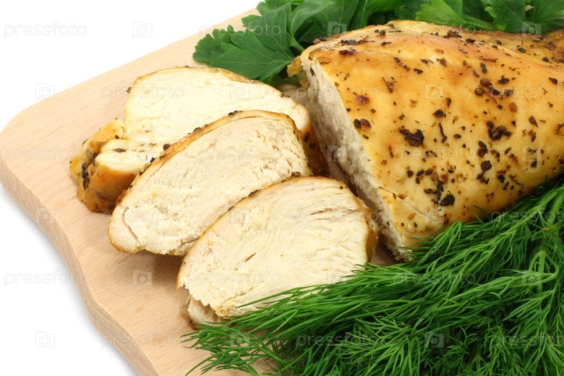 Запеченная куриная грудка и зелень на белом фоне