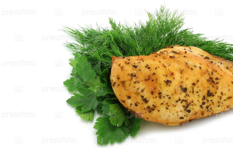 Запеченная куриная грудка и зелень на белом фоне