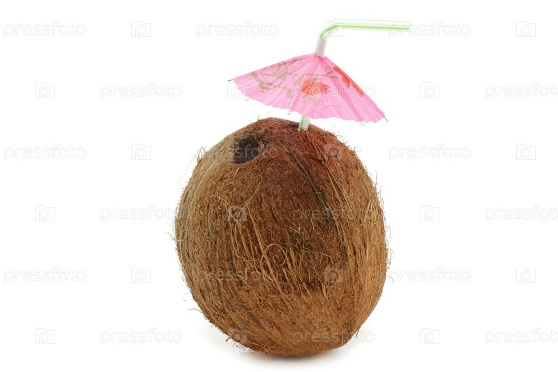 Кокос с трубочкой на белом фоне