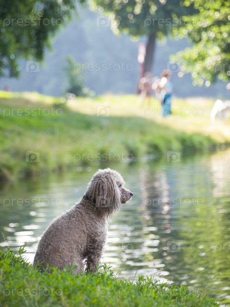 Собака на берегу летнего пруда