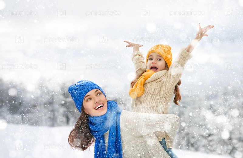 Мать и ребенок девочка на прогулку зимой