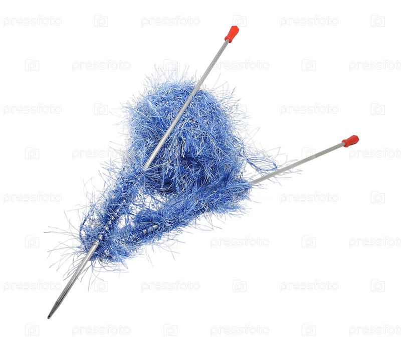 Шарик из нитей синего цвета и вязаных спиц на изолированном белом фоне