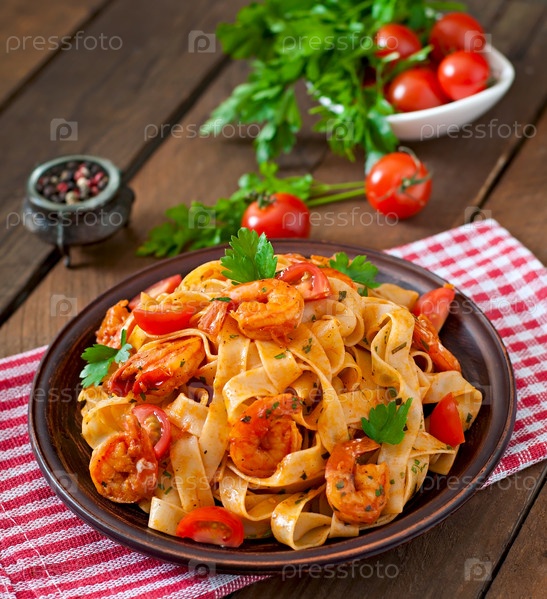Паста с креветками и помидорами