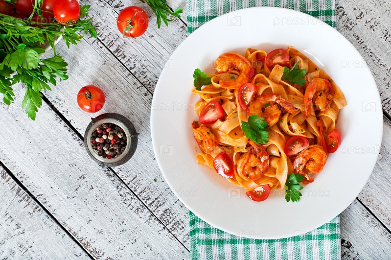 Паста с креветками и помидорами