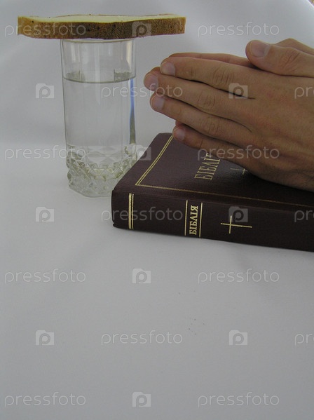 Библия, руки человека, стакан с водой и хлеб