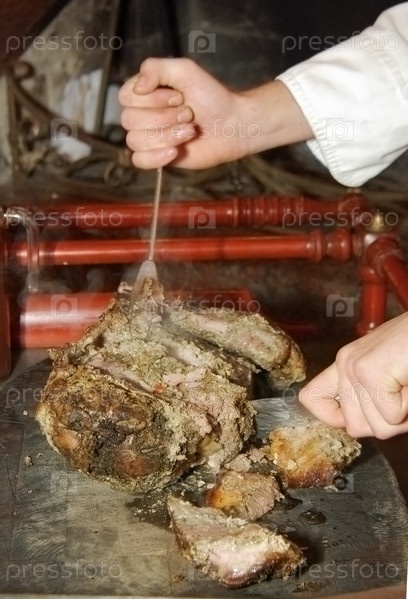 Повар режет мясо