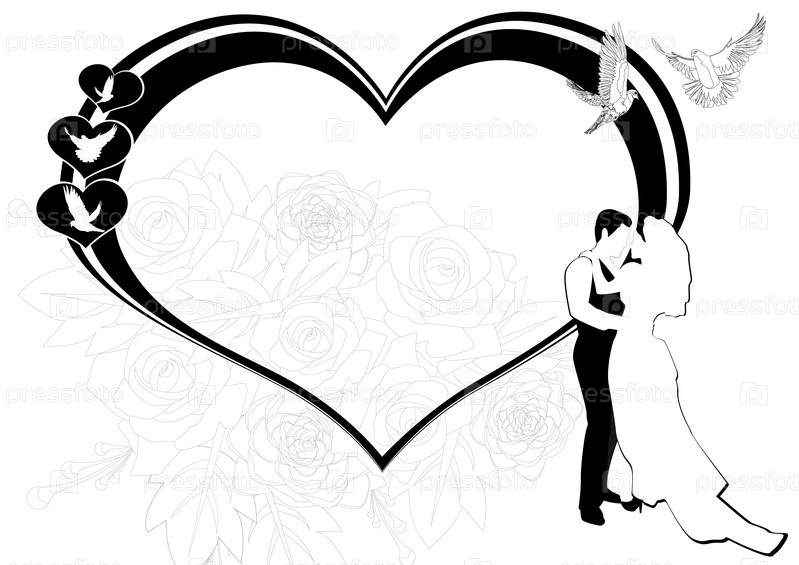 Молодожены и пустое черное сердце, изолированные на белом фоне