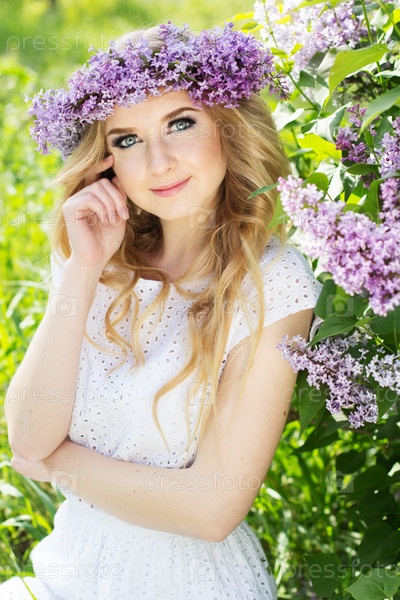 Портрет красивой девушки с венком из цветов сирени