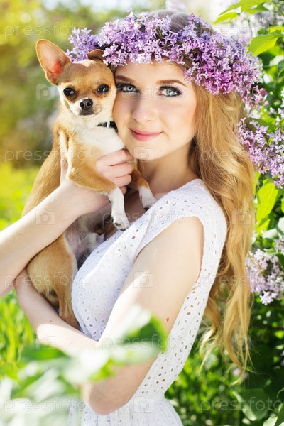 Красивая девушка с сиреневые цветы держит собаку