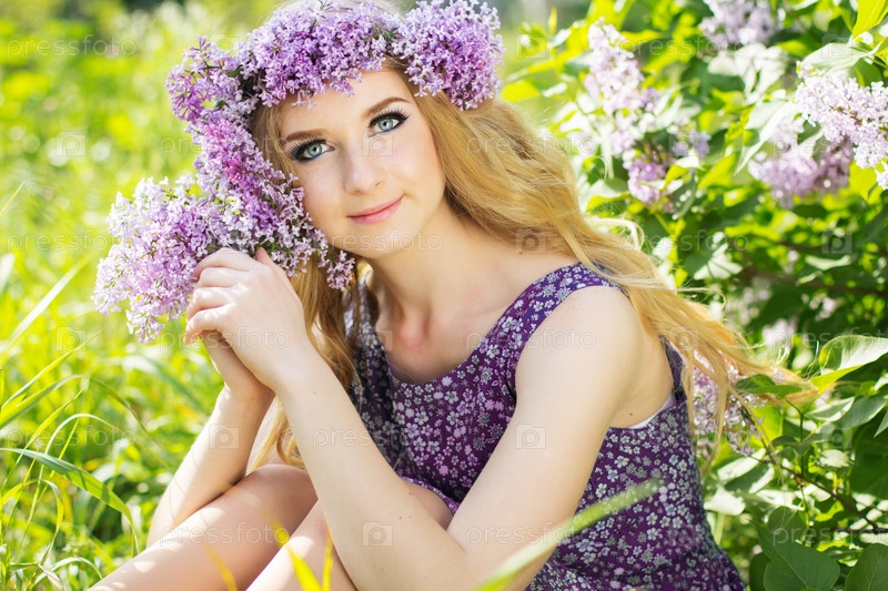 Красивая девочка с венком из цветов сирени