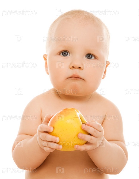 Мальчик ест яблоко.Студийный снимок.Изолирован на белом фоне