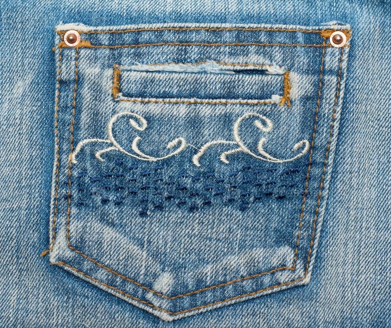 Джинсовый карман, вышивочный рисунок на тканях, заклепки и швейные швы