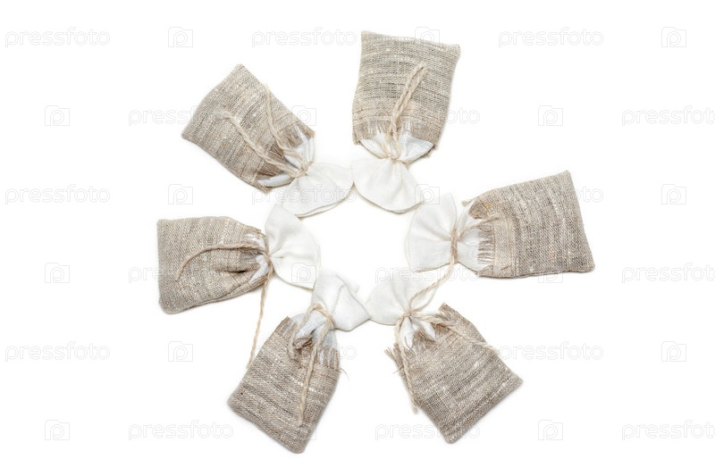 Сумка, пронизанная пряностями и связанной веревкой на белом фоне
