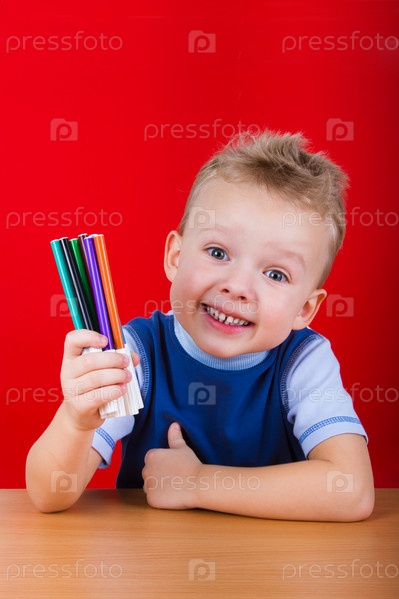 Маленький мальчик, держа цветными маркерами