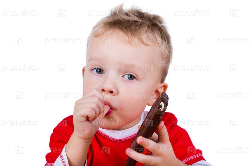 Маленький мальчик ест шоколад